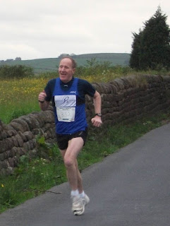 Through half way the chest becomes looser and with a 6.41 fourth mile I've "ticked off" all on my "wish list" and am rapidly catching one young Sale Harrier who turns out to be the 16 year old son (Ben) of club stalwart BILL FOX. My words of encouragement produce a response and we race almost shoulder to shoulder where the narrow course allows for the last mile.